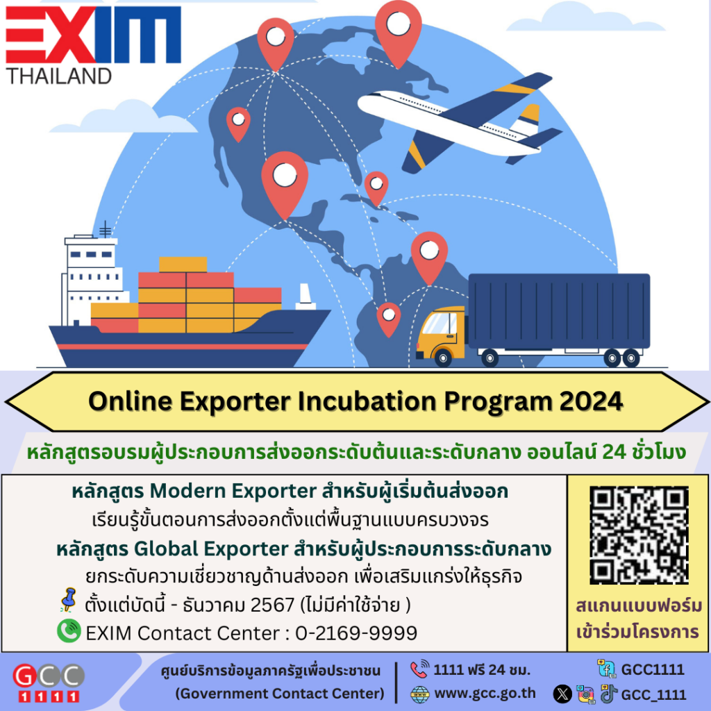 ธนาคารเพื่อการส่งออกและนำเข้าแห่งประเทศไทย จัดอบรมออนไลน์ Online Exporter Incubation Program 2024 หลักสูตรอบรมผู้ประกอบการส่งออกระดับต้นและระดับกลาง เข้าเรียนออนไลน์ 24 ชั่วโมง
