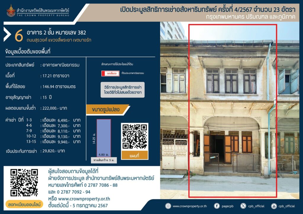 สำนักงานทรัพย์สินพระมหากษัตริย์ เปิดประมูลสิทธิการเช่าอสังหาริมทรัพย์ ครั้งที่ 4/2567 เขตบางรัก