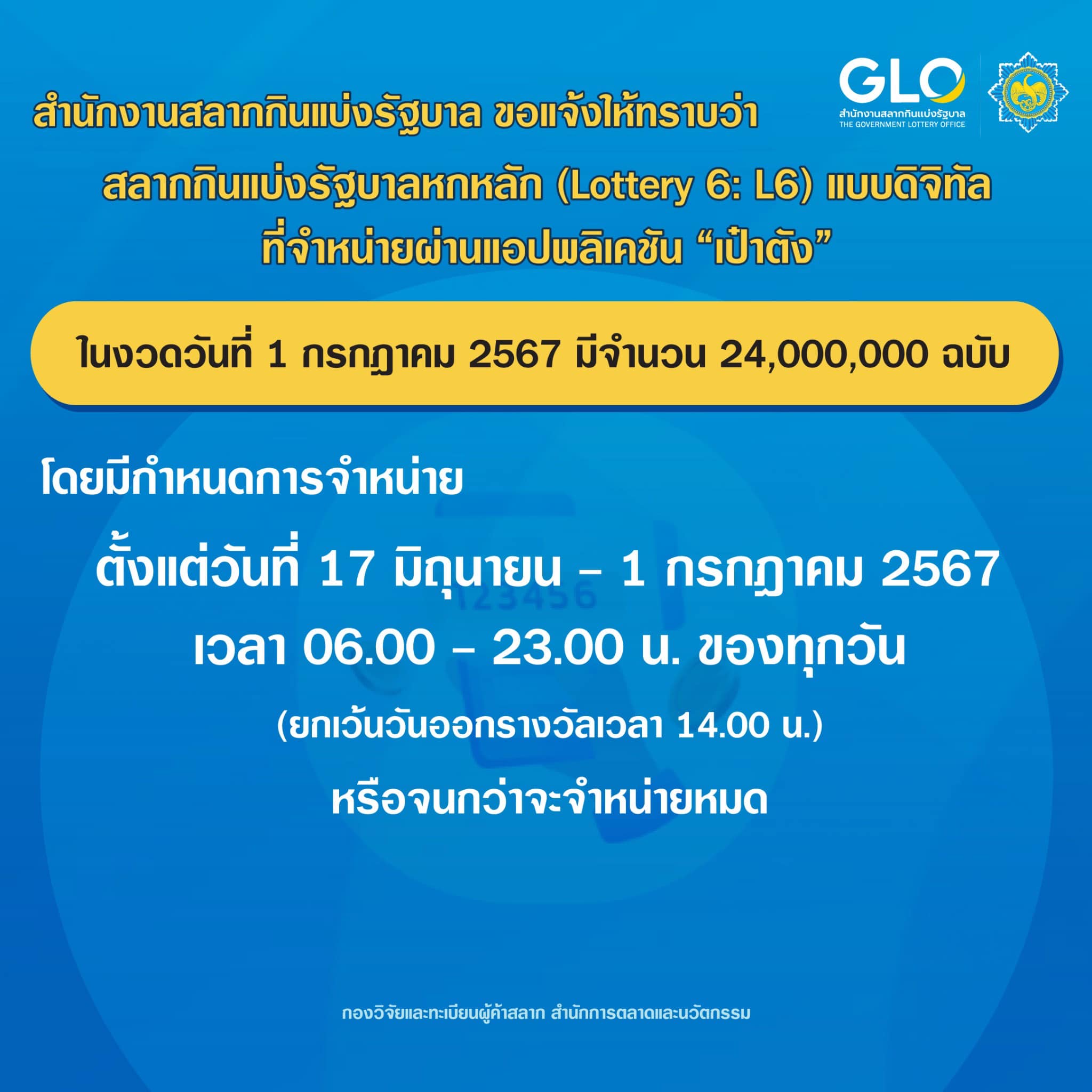 สำนักงานสลากกินแบ่งรัฐบาล แจ้งสลากกินแบ่งรัฐบาลหกหลัก (Lottery 6 : L6) แบบดิจิทัล ที่จำหน่ายผ่านแอปพลิเคชัน “เป๋าตัง” ในงวดวันที่ 1 กรกฎาคม 2567 มีจำนวน 24,000,000 ฉบับ โดยมีกำหนดจำหน่าย ตั้งแต่วันที่ 17 มิถุนายน 2567 ถึง วันที่ 1 กรกฎาคม 2567 ตั้งแต่เวลา 06.00 – 23.00 น. ของทุกวัน ยกเว้นวันออกรางวัลเวลา 14.00 น. หรือจนกว่าจะจำหน่ายหมด