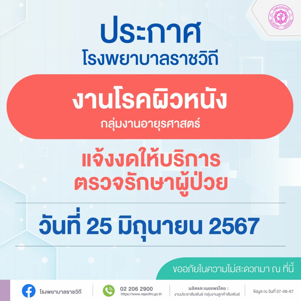 โรงพยาบาลราชวิถี แจ้งงดให้บริการตรวจรักษาผู้ป่วย งานโรคผิวหนัง วันที่ 25 มิถุนายน 2567