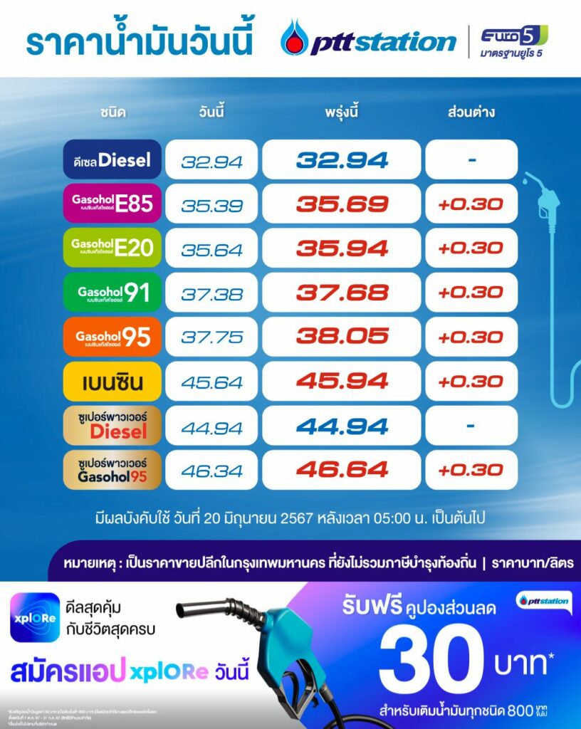 บริษัท ปตท. จำกัด (มหาชน) ปรับขึ้นราคาน้ำมันในกลุ่มเบนซิน มีผลวันที่ 20 มิถุนายน 2567