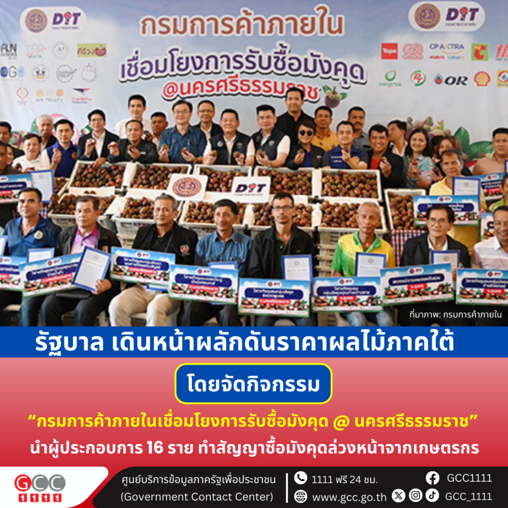 รัฐบาล เดินหน้าผลักดันราคาผลไม้ตลาดภาคใต้ ช่วยเหลือพี่น้องเกษตรกรชาวสวนภาคใต้ จากผลกระทบผลไม้ออกสู่ตลาดเป็นจำนวนมาก โดยได้จัดกิจกรรม “กรมการค้าภายในเชื่อมโยงการรับซื้อมังคุด @นครศรีธรรมราช” นำผู้ประกอบการ 16 ราย มาทำสัญญาซื้อขายมังคุดกับสถาบันเกษตรเกษตรกร