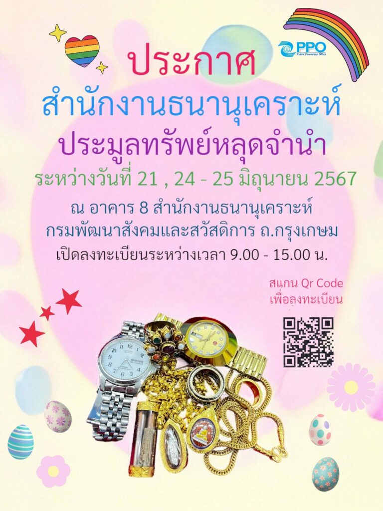 ข่าวประชาสัมพันธ์ สำนักงานธนานุเคราะห์จะจัดงานประมูลทรัพย์หลุดจำนำ ทองรูปพรรณ เพชรรูปพรรณ ทองคำเจือ นาก เงินรูปพรรณ เครื่องใช้ไฟฟ้า และสินค้าเบ็ดเตล็ดอื่นๆ ระหว่างวันที่ 21 , 24 – 25 มิถุนายน 2567 ตั้งแต่เวลา 09.00 น เป็นต้นไป