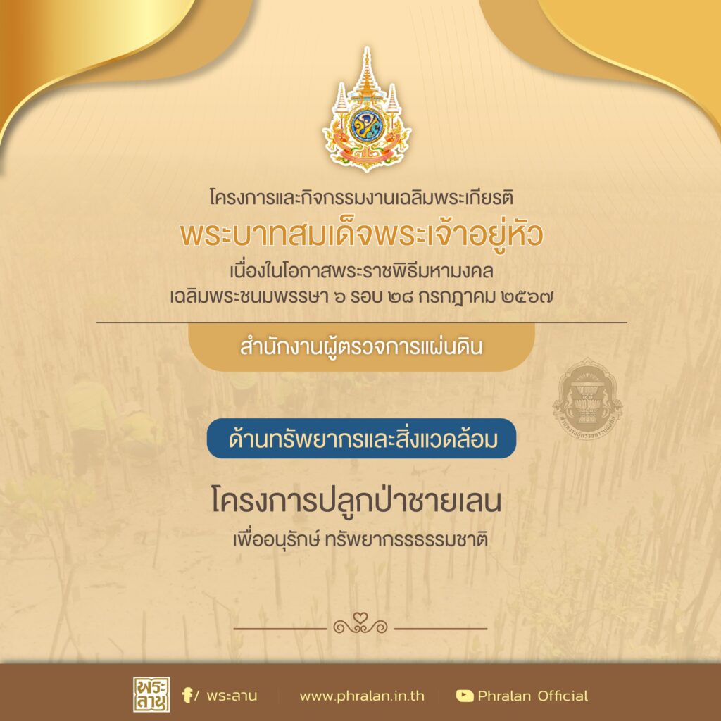 สำนักงานผู้ตรวจการแผ่นดิน จัดกิจกรรมเฉลิมพระเกียรติฯ ด้านทรัพยากรและสิ่งแวดล้อม เนื่องในโอกาสพระราชพิธีมหามงคลเฉลิมพระชนมพรรษา พระบาทสมเด็จพระเจ้าอยู่หัว 6 รอบ 28 กรกฎาคม 2567 โดยจัดโครงการปลูกป่าชายเลน เพื่ออนุรักษ์ ทรัพยากรรธรรมชาติ ปลูกป่าชายเลนเฉลิมพระเกียรติ 100 ต้น ณ ศูนย์อนุรักษ์ป่าชายเลนคลองโคน ตำบลคลองโคน อำเภออัมพวา จังหวัดสมุทรสงคราม ในเดือนกรกฎาคม 2567
