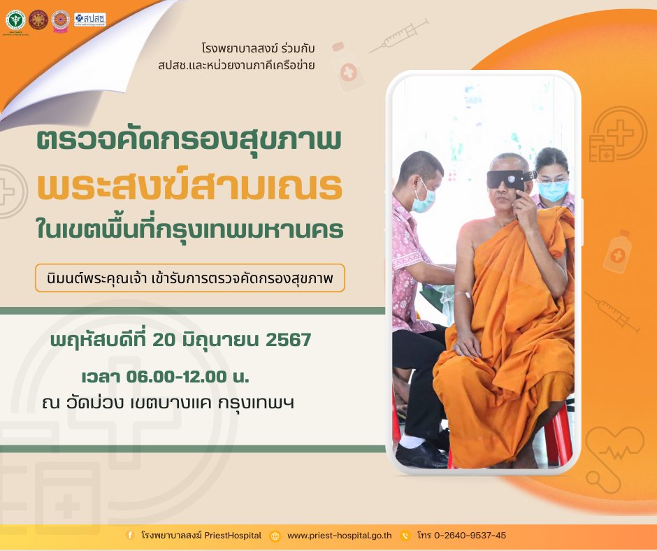 โรงพยาบาลสงฆ์ร่วม กับ สำนักงานหลักประกันสุขภาพแห่งชาติ และหน่วยงานภาคีเครือข่าย ออกให้บริการตรวจคัดกรองสุขภาพพระสงฆ์สามเณรในเขตพื้นที่กรุงเทพมหานคร  ในวันที่ 20 มิถุนายน 2567 ตั้งแต่เวลา 06.00 – 12.00 น. ณ วัดม่วง เขตบางแค กรุงเทพมหานคร