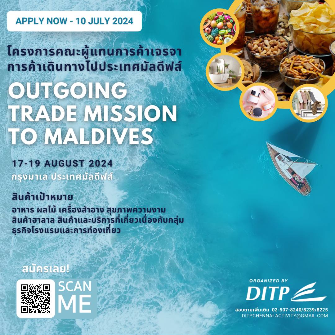 กรมส่งเสริมการค้าระหว่างประเทศ จัดโครงการคณะผู้แทนการค้าเจรจาการค้าในประเทศมัลดีฟส์ ระหว่างวันที่ 17 – 19 กรกฎาคม 2567 ณ กรุงมาเล ประเทศมัลดีฟส์