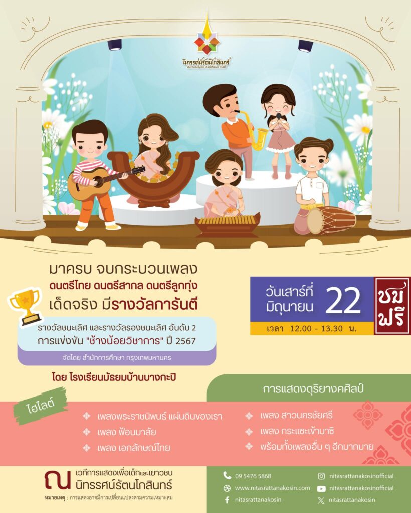 นิทรรศน์รัตนโกสินทร์ จัดเวทีการแสดงเพื่อเด็กและเยาวชน ในวันเสาร์ที่ 22 มิถุนายน 2567 โดยโรงเรียนมัธยมบ้านบางกะปิ แสดงดนตรีไทย ดนตรีสากล ดนตรีลูกทุ่ง