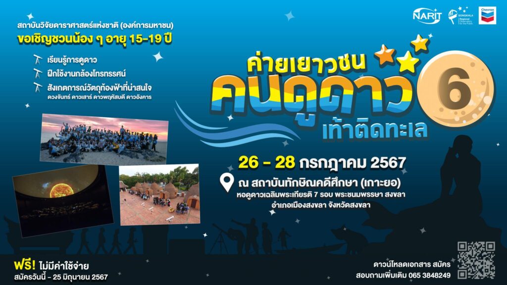 สถาบันวิจัยดาราศาสตร์แห่งชาติ ขอเชิญชวนน้อง ๆ อายุ 15 – 19 ปี สมัครเข้าร่วมค่ายเยาวชนคนดูดาวเท้าติดทะเล ปีที่ 6 วันที่ 26 – 28 กรกฎาคม 2567 ณ สถาบันทักษิณคดีศึกษา (เกาะยอ) อำเภอเมืองสงขลา จังหวัดสงขลา