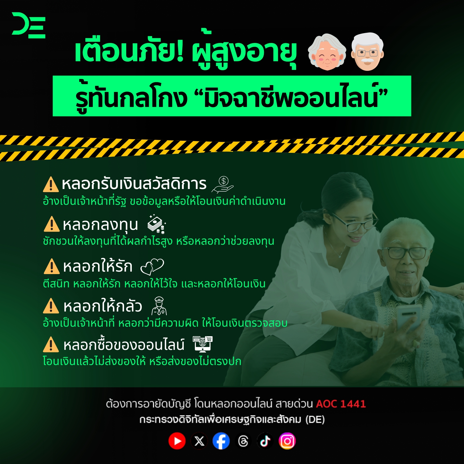 กระทรวงดิจิทัลเพื่อเศรษฐกิจและสังคม แจ้งเตือนภัย ผู้สูงอายุ รู้ทันกลโกง มิจฉาชีพออนไลน์
