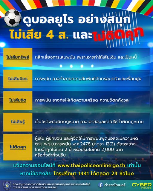 ตำรวจไซเบอร์ เตือนภัยดูบอลยูโร อย่างสนุก ไม่เสีย 4 ส. และ ไม่ติดคุก