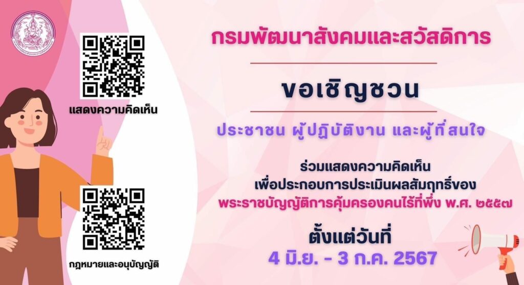 กรมพัฒนาสังคมและสวัสดิการ ขอเชิญชวนภาคีเครือข่าย ประชาชน และผู้ที่สนใจ ร่วมแสดงความคิดเห็น เพื่อประกอบการประเมินผลสัมฤทธิ์ของ พระราชบัญญัติการคุ้มครองคนไร้ที่พึ่ง พ.ศ. 2557 ตั้งแต่วันที่ 4 มิถุนายน 2567 – 3 กรกฎาคม 2567