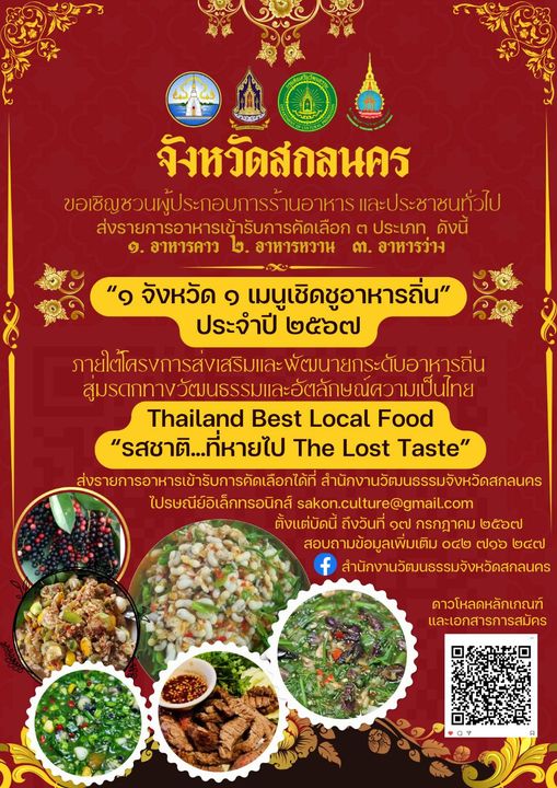 กรมส่งเสริมวัฒนธรรม ขอเชิญร่วมเสนอเมนูเมนูอาหารคาว หวาน และอาหารว่างเข้ารับการคัดเลือกเป็นเมนูอาหารถิ่นจังหวัดสกลนคร 1 จังหวัด 1 เมนู เชิดชูอาหารถิ่น ภายใต้โครงการ ส่งเสริมและพัฒนายกระดับอาหารถิ่นสู่มรดกทางวัฒนธรรมและอัตลักษณ์ความเป็นไทย (Thailand Best Local Food ) “รสชาติ…ที่หายไป” The Lost Taste ประจำปี 2567 ตั้งแต่บัดนี้ – 17 กรกฎาคม 2567