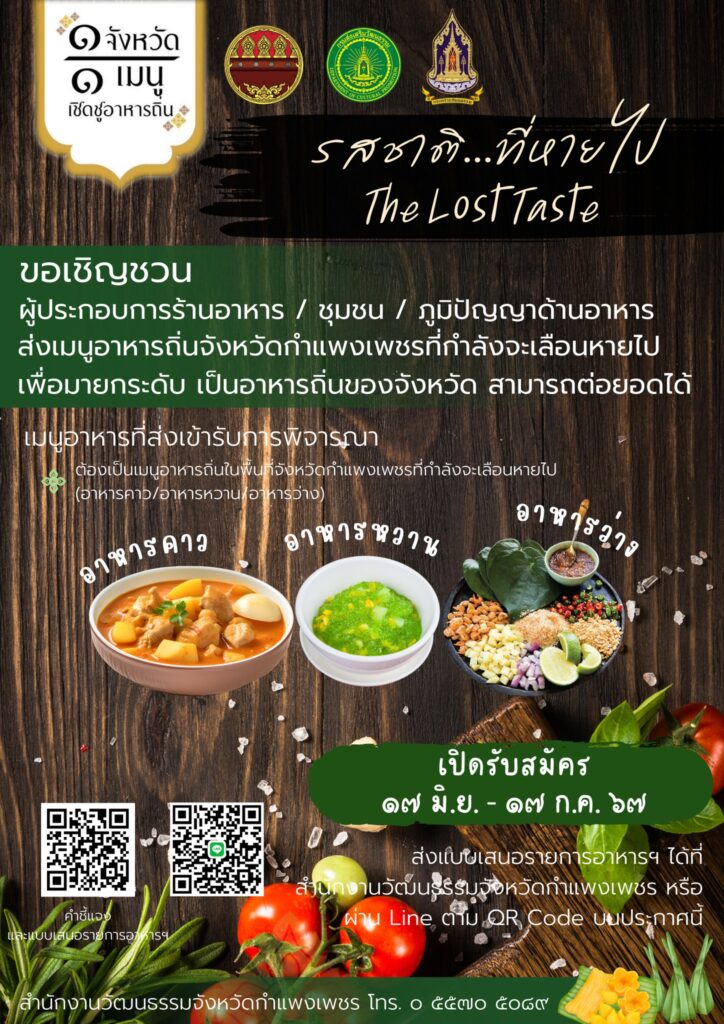 กรมส่งเสริมวัฒนธรรม ขอเชิญร่วมเสนอเมนูเมนูอาหารคาว หวาน และอาหารว่างเข้ารับการคัดเลือกเป็นเมนูอาหารถิ่นจังหวัดกำแพงเพชร 1 จังหวัด 1 เมนู เชิดชูอาหารถิ่น ภายใต้โครงการ ส่งเสริมและพัฒนายกระดับอาหารถิ่นสู่มรดกทางวัฒนธรรมและอัตลักษณ์ความเป็นไทย (Thailand Best Local Food ) “รสชาติ…ที่หายไป” The Lost Taste ประจำปี 2567 ตั้งแต่บัดนี้ – 17 กรกฎาคม 2567