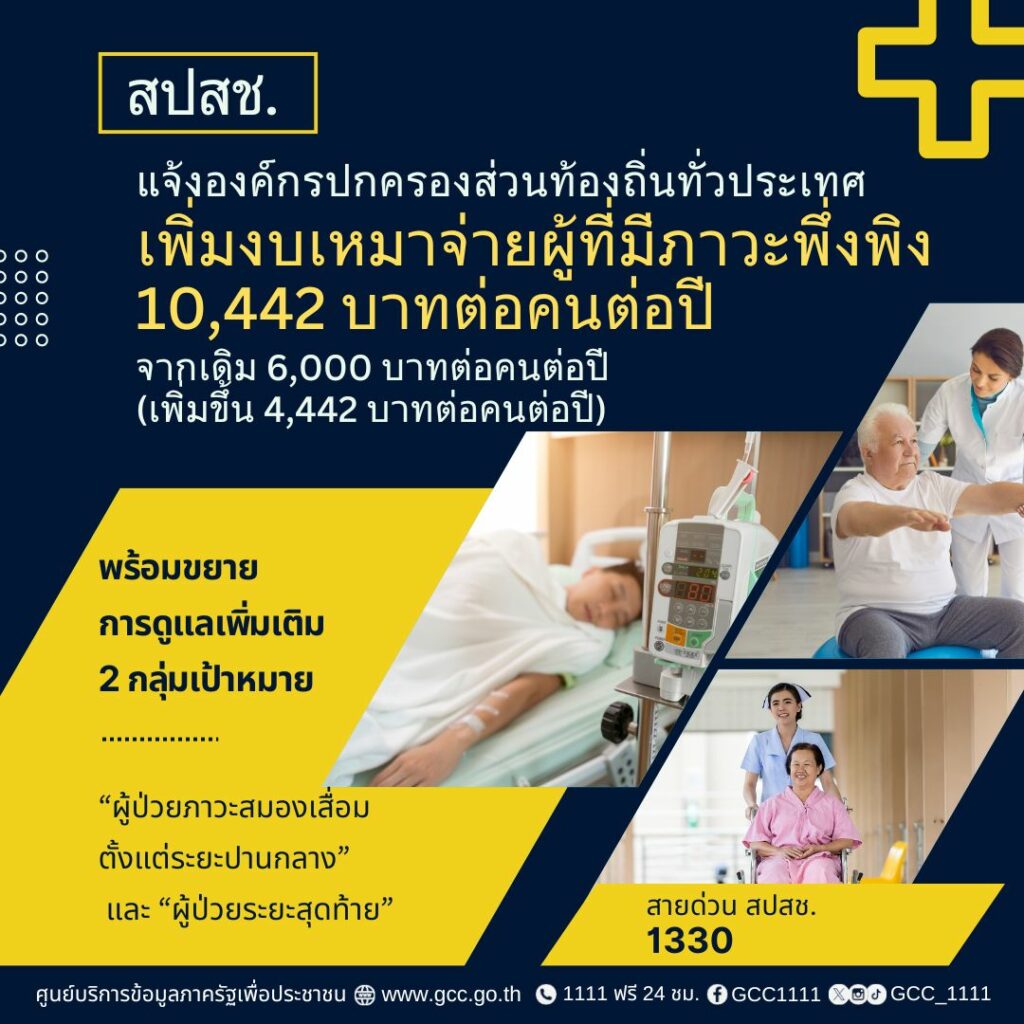 สปสช. แจ้งองค์กรปกครองส่วนท้องถิ่นทั่วประเทศ เพิ่มงบเหมาจ่ายผู้ที่มีภาวะพึ่งพิง 10,442 บาทต่อคนต่อปี