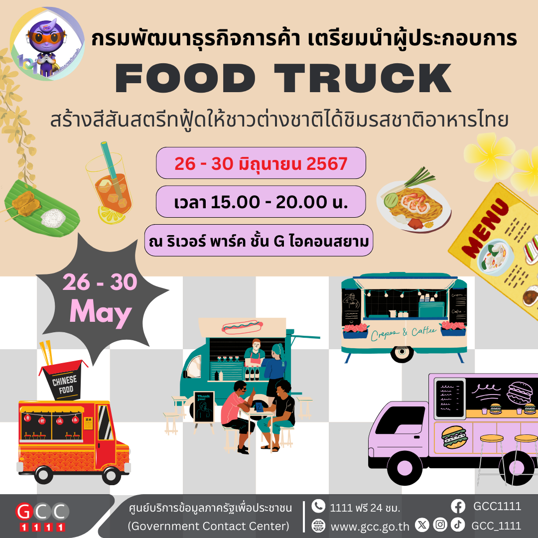 กรมพัฒนาธุรกิจการค้า เตรียมนำผู้ประกอบการฟู้ดทรัคสร้างสีสันสตรีทฟู้ดให้ชาวต่างชาติได้ชิมรสชาติอาหารไทย ประกอบด้วย อาหารไทย อาหารอินเตอร์ อาหารว่าง ขนมหวาน และเครื่องดื่ม ระหว่างวันที่ 26 – 30 มิถุนายน 2567 เวลา 15.00 – 20.00 น. ณ ริเวอร์ พาร์ค ชั้น G ไอคอนสยาม ซึ่งนอกจากจะได้ลิ้มชิมรสอาหารและเครื่องดื่มที่อร่อยไม่ซ้ำใครแล้ว ยังเป็นการช่วยเหลือและให้กำลังใจผู้ประกอบการฟู้ดทรัคซึ่งเป็นผู้ประกอบการเอสเอ็มอีของไทยอีกทางหนึ่งด้วย
