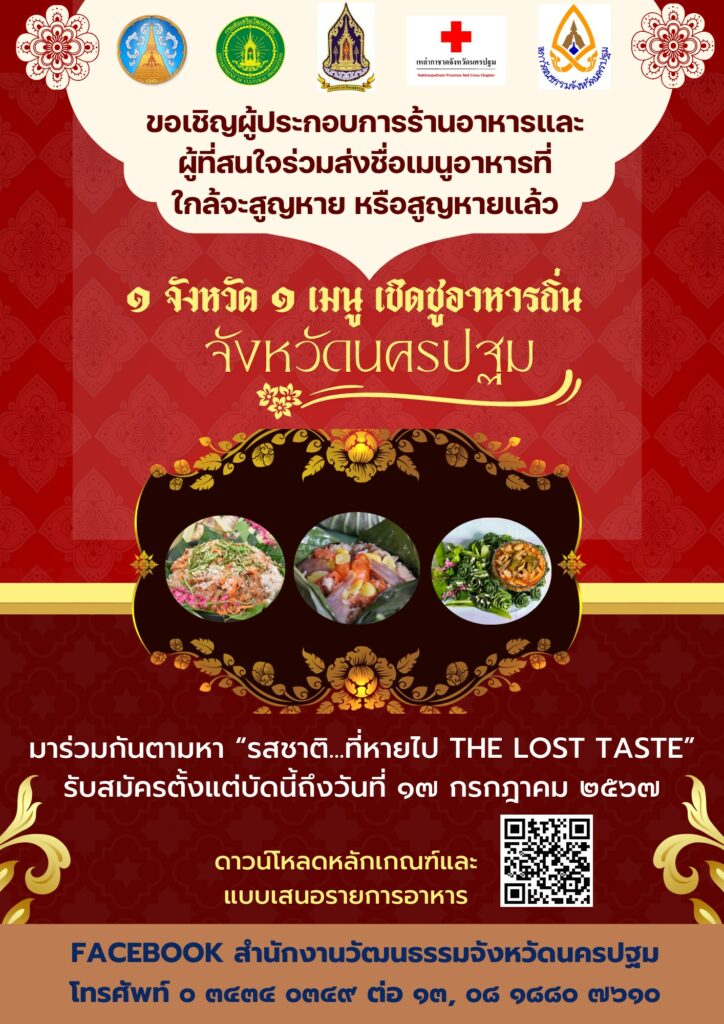 กรมส่งเสริมวัฒนธรรม ขอเชิญร่วมเสนอเมนูเมนูอาหารคาว หวาน และอาหารว่างเข้ารับการคัดเลือกเป็นเมนูอาหารถิ่นจังหวัดนครปฐม 1 จังหวัด 1 เมนู เชิดชูอาหารถิ่น ภายใต้โครงการ ส่งเสริมและพัฒนายกระดับอาหารถิ่นสู่มรดกทางวัฒนธรรมและอัตลักษณ์ความเป็นไทย (Thailand Best Local Food ) “รสชาติ…ที่หายไป” The Lost Taste ประจำปี 2567 ตั้งแต่บัดนี้ – 17 กรกฎาคม 2567