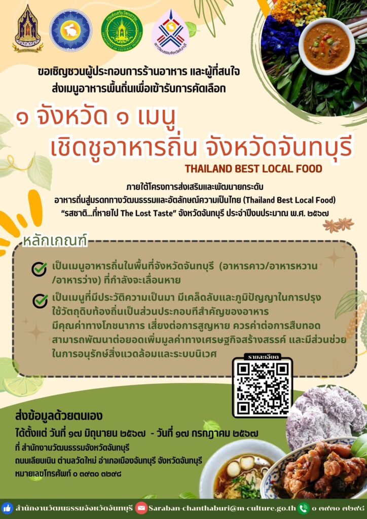 กรมส่งเสริมวัฒนธรรม ขอเชิญร่วมเสนอเมนูเมนูอาหารคาว หวาน และอาหารว่างเข้ารับการคัดเลือกเป็นเมนูอาหารถิ่นจังหวัดจันทบุรี 1 จังหวัด 1 เมนู เชิดชูอาหารถิ่น ภายใต้โครงการ ส่งเสริมและพัฒนายกระดับอาหารถิ่นสู่มรดกทางวัฒนธรรมและอัตลักษณ์ความเป็นไทย (Thailand Best Local Food ) “รสชาติ…ที่หายไป” The Lost Taste ประจำปี 2567 ตั้งแต่บัดนี้ – 17 กรกฎาคม 2567