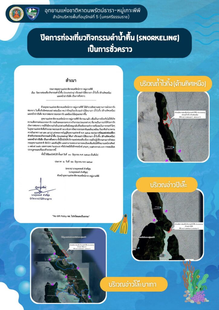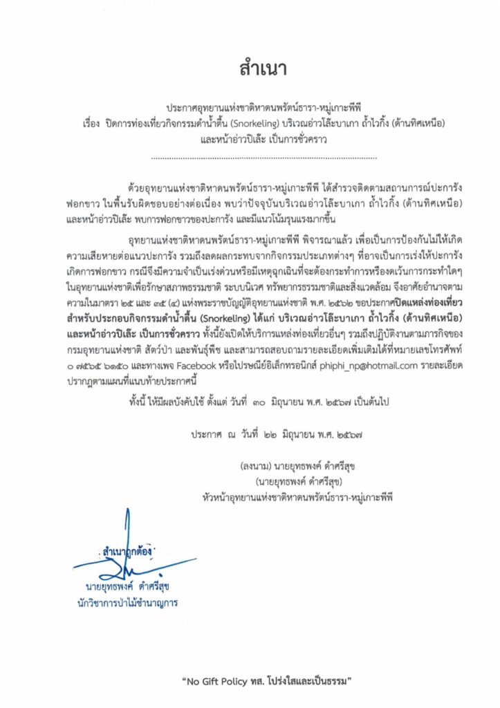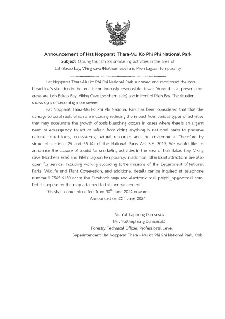 ประกาศอุทยานแห่งชาติหาดนพรัตน์ธารา-หมู่เกาะพีพี ประกาศปิดการท่องเที่ยวกิจกรรมดำน้ำตื้น และกิจกรรมดำน้ำลึก บริเวณอ่าวโล๊ะบาเกา ถ้ำไวกิ้ง (ด้านทิศเหนือ) และหน้าอ่าวปิเล๊ะ เป็นการชั่วคราว หลังเกิดปะการังฟอกขาวรุนแรงในพื้นที่ เริ่มตั้งแต่ 30 มิถุนายน 2567 ทั้งนี้ ยังเปิดให้บริการแหล่งท่องเที่ยวอื่น ๆ ตามปกติ สอบถามรายละเอียดเพิ่มเติมได้ที่ หมายเลขโทรศัพท์ 075 656 150 และทางเพจ Facebook หรือ อีเมล phiphi_np@hotmail.com