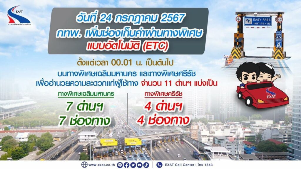 - สอบถามข้อมูลเพิ่มเติมได้ที่ ศูนย์บริการข้อมูล ผู้ใช้ทางพิเศษ (EXAT Call Center) โทร 1543 ได้ตลอด 24 ชั่วโมง