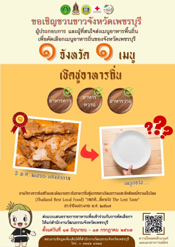 กรมส่งเสริมวัฒนธรรม ขอเชิญร่วมเสนอเมนูเมนูอาหารคาว หวาน และอาหารว่างเข้ารับการคัดเลือกเป็นเมนูอาหารถิ่นจังหวัดเพชรบุรี 1 จังหวัด 1 เมนู เชิดชูอาหารถิ่น ภายใต้โครงการ ส่งเสริมและพัฒนายกระดับอาหารถิ่นสู่มรดกทางวัฒนธรรมและอัตลักษณ์ความเป็นไทย (Thailand Best Local Food ) “รสชาติ…ที่หายไป” The Lost Taste ประจำปี 2567 ตั้งแต่บัดนี้ – 17 กรกฎาคม 2567