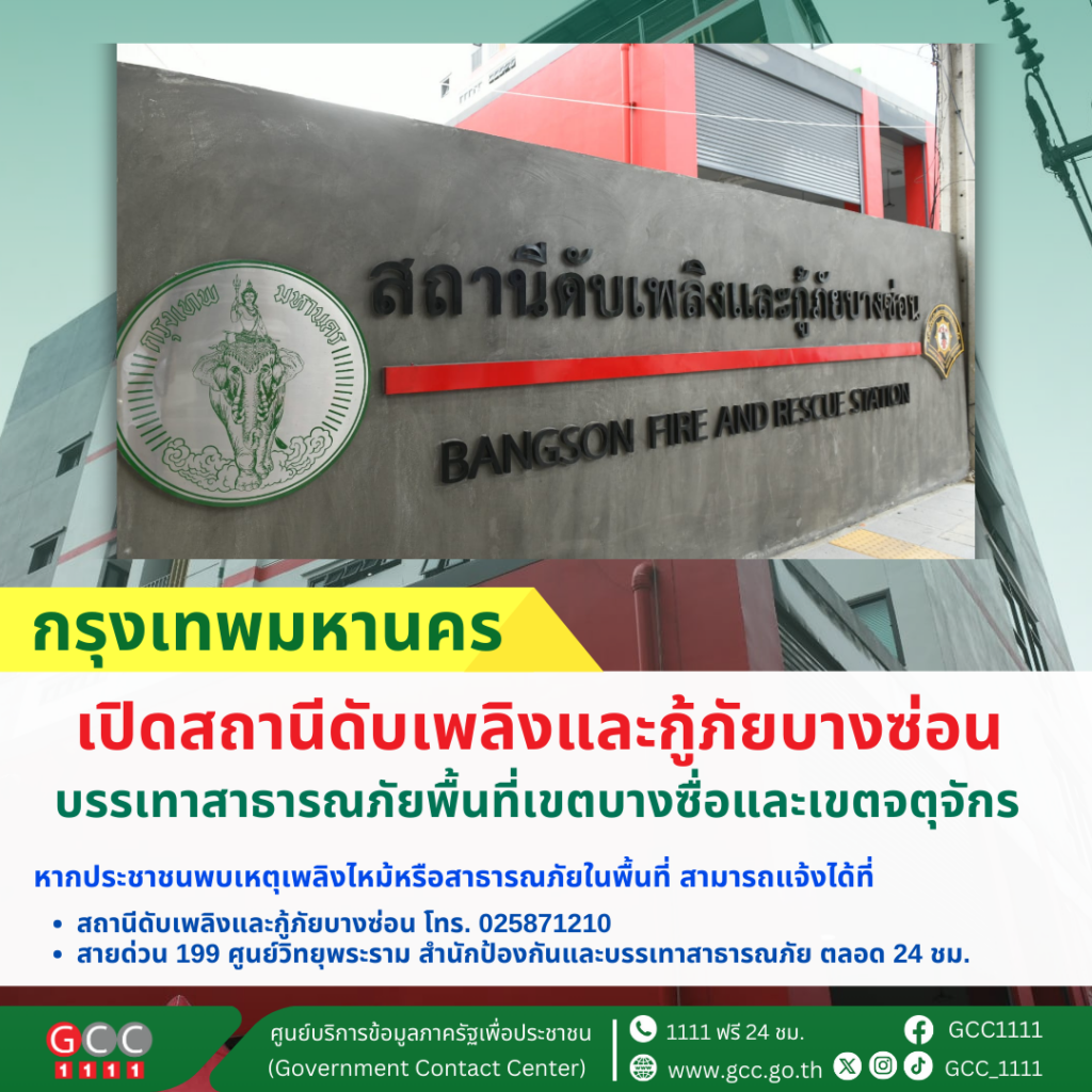 กรุงเทพมหานคร เปิดอาคารสถานีดับเพลิงและกู้ภัยบางซ่อน บรรเทาสาธารณภัยพื้นที่บางซื่อและจตุจักร ตั้งอยู่เลขที่ 2520 ถนนกรุงเทพ-นนทบุรี แขวงวงศ์สว่าง เขตบางซื่อ กรุงเทพมหานคร