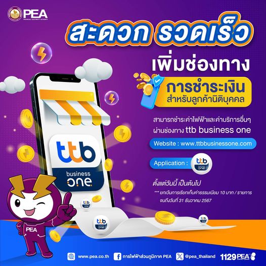 การไฟฟ้าส่วนภูมิภาค เพิ่มช่องทางการชำระเงินค่าไฟฟ้าและค่าบริการอื่น ๆ สำหรับลูกค้านิติบุคคล ผ่านช่องทาง Application : ttb business one และเว็บไซต์ www.ttbbusinessone.com ฟรีค่าธรรมเนียมตั้งแต่บัดนี้ – 31 ธันวาคม 2567