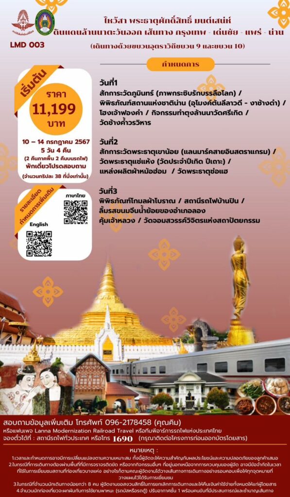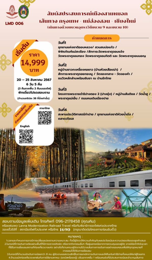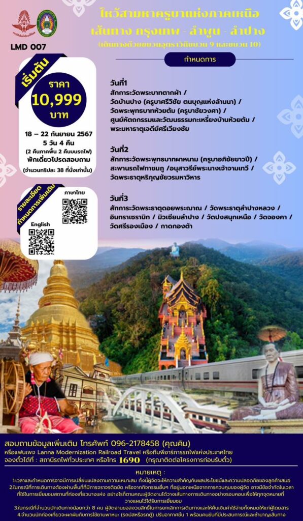 การรถไฟแห่งประเทศไทย ร่วมกับ มหาวิทยาลัยราชภัฏลำปาง จัดโปรแกรมท่องเที่ยวต้อนปลายฝนต้นหนาว “นั่งรถไฟไปแอ่วเหนือม่วนใจ๋ เที่ยวแบบไทยในวิถีล้านนา” ระหว่างเดือนกรกฎาคม – กันยายน 2567