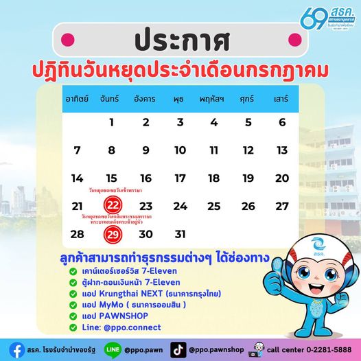 สถานธนานุเคราะห์ โรงรับจำนำของรัฐ แจ้งวันหยุดประจำเดือนกรกฎาคม 2567