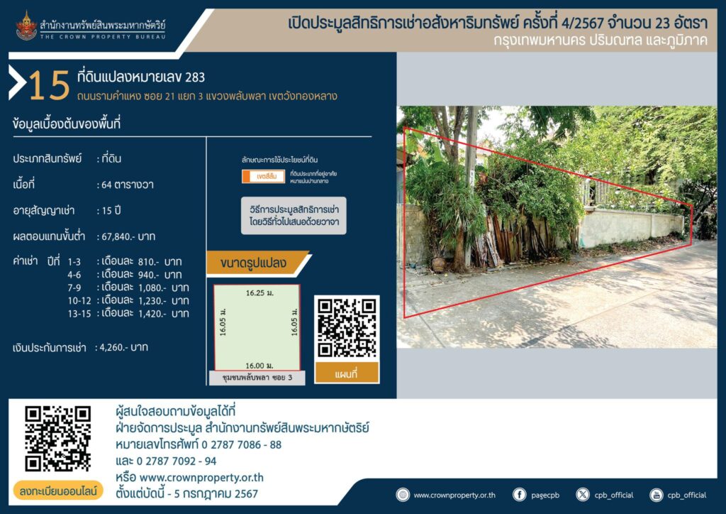 สำนักงานทรัพย์สินพระมหากษัตริย์ เปิดประมูลสิทธิการเช่าอสังหาริมทรัพย์ ครั้งที่ 4/2567 เขตวังทองหลาง กรุงเทพมหานคร
