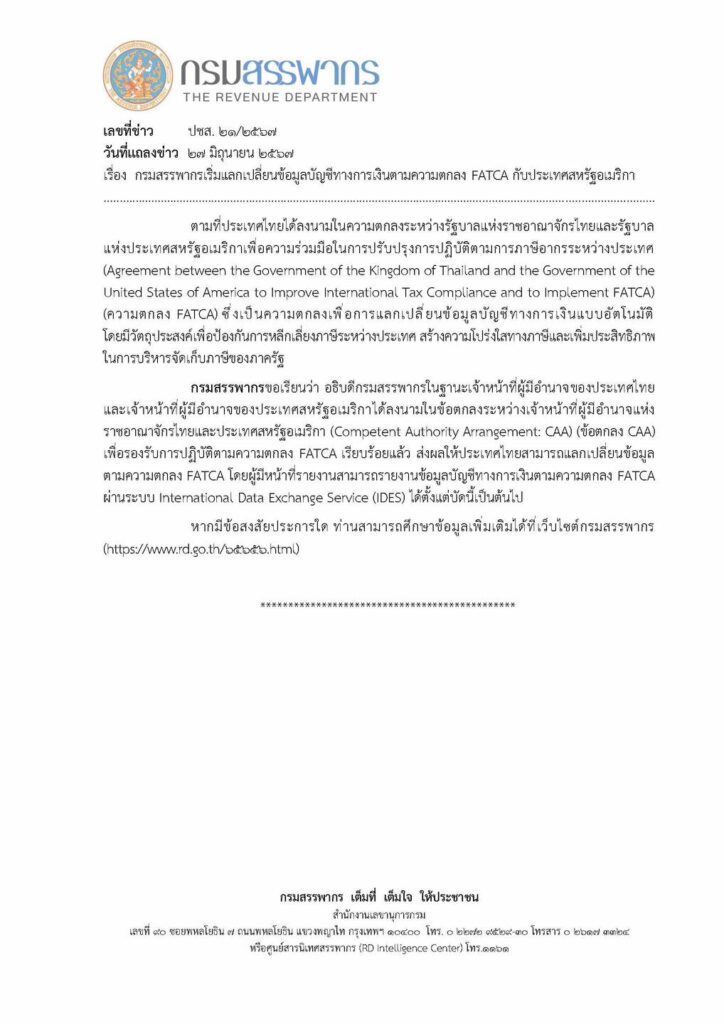 กรมสรรพากร เริ่มแลกเปลี่ยนข้อมูลบัญชีทางการเงินตามความตกลง FATCA กับประเทศสหรัฐอเมริกา ตามที่ประเทศไทยได้ลงนามในความตกลงระหว่างรัฐบาลแห่งราชอาณาจักรไทย และรัฐบาลแห่งประเทศสหรัฐอเมริกา เพื่อความร่วมมือในการปรับปรุงการปฏิบัติตามการภาษีอากรระหว่างประเทศ เป็นความตกลงเพื่อการแลกเปลี่ยนข้อมูลบัญชีทางการเงินแบบอัตโนมัติ โดยมีวัตถุประสงค์เพื่อป้องกันการหลีกเลี่ยงภาษีระหว่างประเทศ สร้างความโปร่งใสและเพิ่มประสิทธิภาพ ในการบริหารจัดเก็บภาษีของภาครัฐ ได้ลงนามในข้อตกลง FATCA เรียบร้อยแล้ว ส่งผลให้ประเทศไทยสามารถแลกเปลี่ยนข้อมูล โดยผู้มีหน้าที่รายงานสามารถรายงานข้อมูลบัญชีทางการเงินตามความตกลง FATCA ผ่านระบ U International Data Exchange Service (IDES) ได้ตั้งแต่บัดนี้เป็นต้นไป หากมีข้อสงสัยประการใด สามารถศึกษาข้อมูลเพิ่มเติมได้ที่ เว็บไซต์ กรมสรรพากร http://www.rd.go.th/b@ba๖.html
