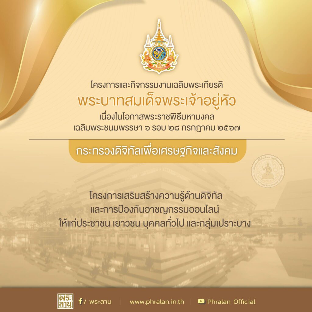 เนื่องในโอกาสพระราชพิธีมหามงคลเฉลิมพระชนมพรรษา พระบาทสมเด็จพระเจ้าอยู่หัว 6 รอบ 28 กรกฎาคม 2567 กระทรวงดิจิทัลเพื่อเศรษฐกิจและสังคม จัดโครงการเสริมสร้างความรู้ด้านดิจิทัลและการป้องกันอาชญกรรมออนไลน์ ให้แก่ ประชาชน เยาวชน บุคคลทั่วไป และกลุ่มเปราะบาง