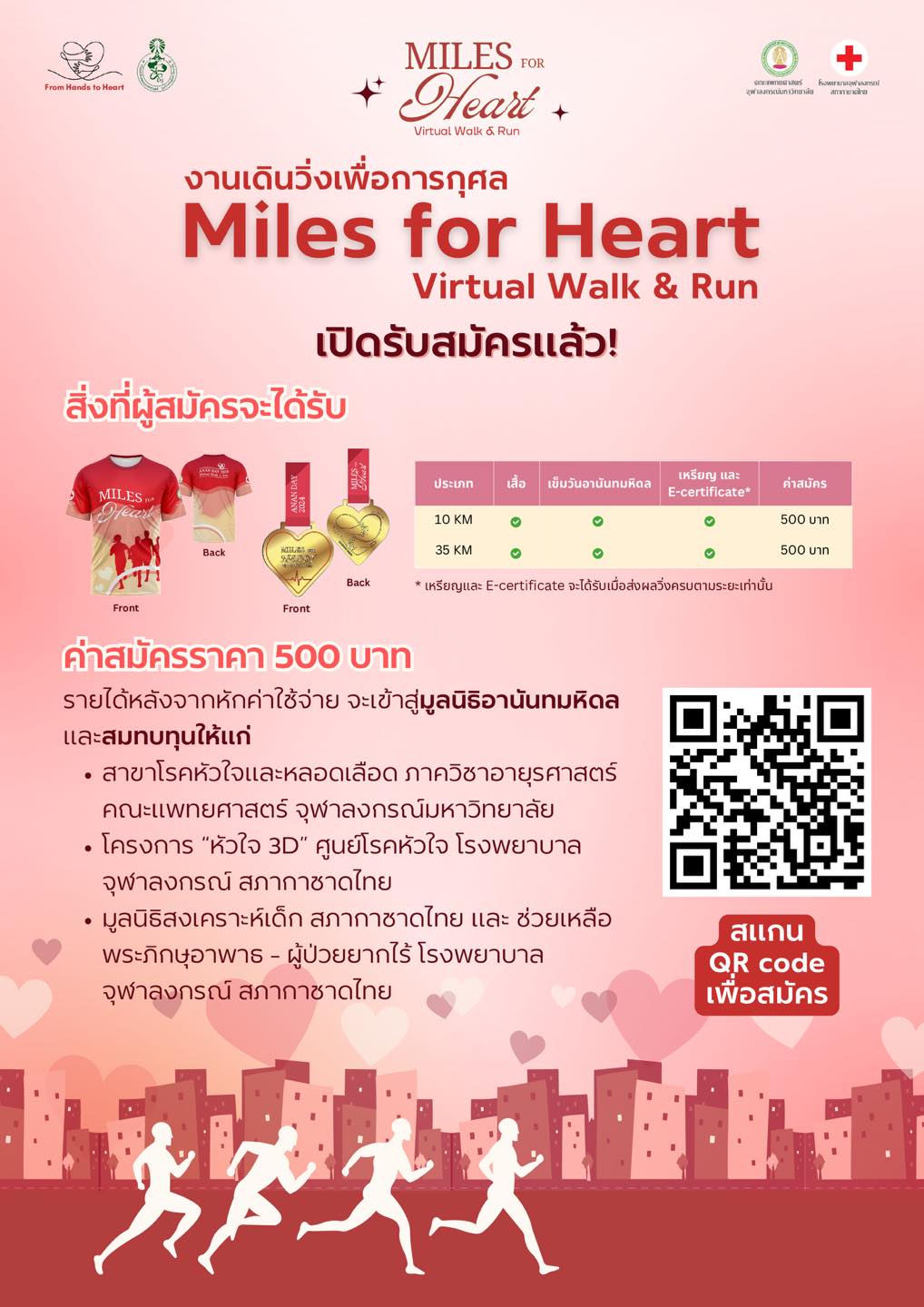 โรงพยาบาลจุฬาลงกรณ์ สภากาชาดไทย เชิญชวนร่วมกิจกรรมเดิน – วิ่งเพื่อการกุศล “Miles for Heart” Virtual Walk & Run เพื่อสมทบทุนให้แก่มูลนิธิอานันทมหิดล สาขาโรคหัวใจและหลอดเลือด ภาควิชาอายุรศาสตร์ คณะแพทยศาสตร์ จุฬาฯ และโครงการ “หัวใจ 3D” ศูนย์โรคหัวใจ โรงพยาบาลจุฬาลงกรณ์ สภากาชาดไทย สมัครได้ตั้งแต่บัดนี้ – 31 กรกฎาคม 2567
