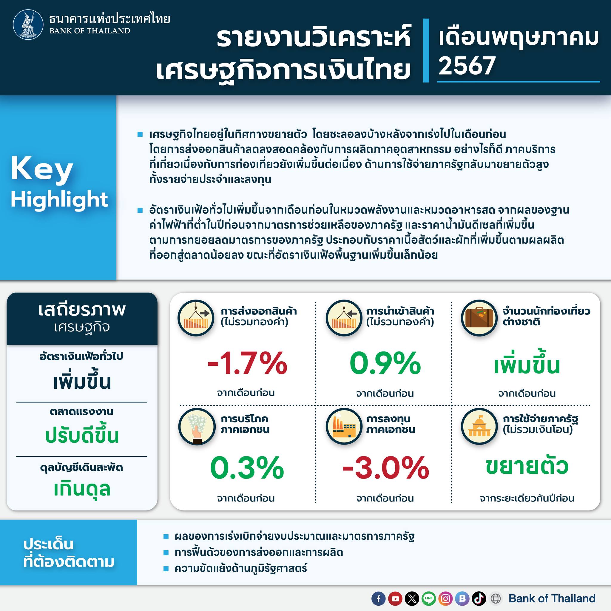 ธนาคารแห่งประเทศไทย สรุปรายงานวิเคราะห์เศรษฐกิจการเงินไทย เดือนพฤษภาคม ปี 2567