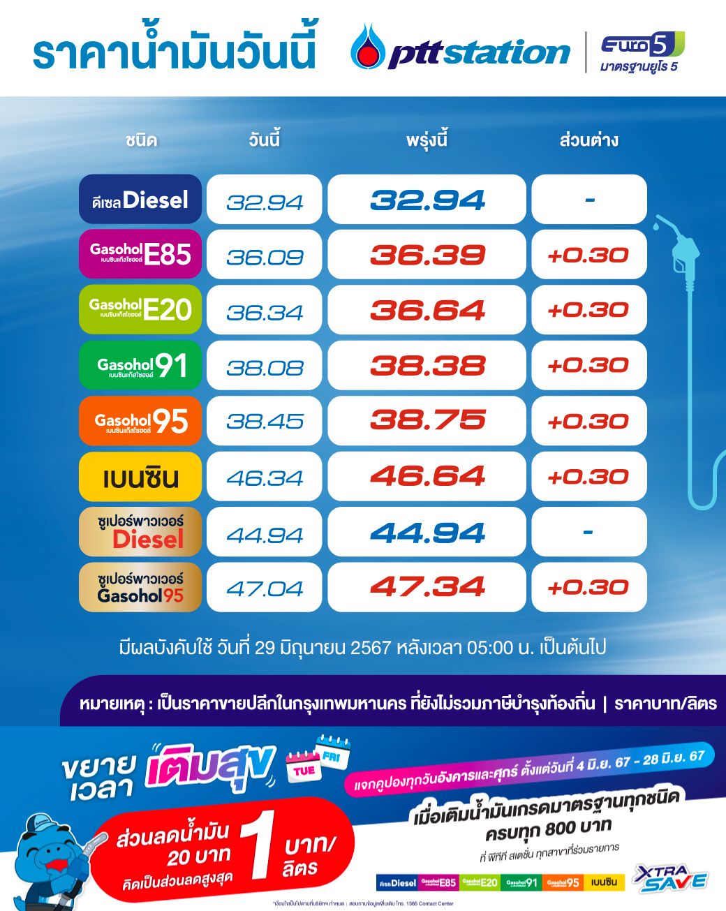 บริษัท ปตท. จำกัด (มหาชน) ปรับขึ้นราคาน้ำมันในกลุ่มเบนซินโดยน้ำมันในกลุ่มเบนซิน ปรับขึ้นราคา 0.30 บาท/ลิตร ส่วนน้ำมันในกลุ่มดีเซลราคาคงเดิม มีผลวันที่ 29 มิถุนายน 2567 หลังเวลา 05.00 น. เป็นต้นไป ราคาที่ประกาศเป็นราคาขายปลีกในกรุงเทพมหานคร ที่ยังไม่รวมภาษีบำรุงท้องถิ่น