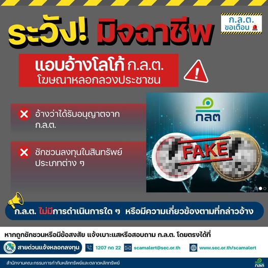 สำนักงานคณะกรรมการกำกับหลักทรัพย์และตลาดหลักทรัพย์ เตือนระวังมิจฉาชีพแอบอ้างโลโก้สำนักงานคณะกรรมการกำกับหลักทรัพย์และตลาดหลักทรัพย์ อ้างว่าได้รับอนุญาตจากสำนักงานคณะกรรมการกำกับหลักทรัพย์และตลาดหลักทรัพย์ และชักชวนลงทุนในสินทรัพย์ประเภทต่าง ๆ สำนักงานคณะกรรมการกำกับหลักทรัพย์และตลาดหลักทรัพย์ ไม่มีการดำเนินการใด ๆ หรือมีความเกี่ยวข้องตามที่กล่าวอ้าง