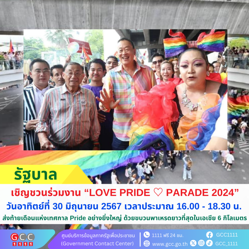 นายกรัฐมนตรี เชิญชวนร่วมงาน “LOVE PRIDE ♡ PARADE 2024” ส่งท้ายเดือนแห่งเทศกาล Pride อย่างยิ่งใหญ่ ด้วยขบวนพาเหรดยาวที่สุดในเอเชีย 6 กิโลเมตร พร้อมนำเสนอภาพลักษณ์ไทยสู่การเป็น Pride Friendly Destination คาดการณ์มีผู้ร่วมงานกว่า 1 ล้านคน ต่อยอดผลักดันไทยเป็นเจ้าภาพ World Pride 2030