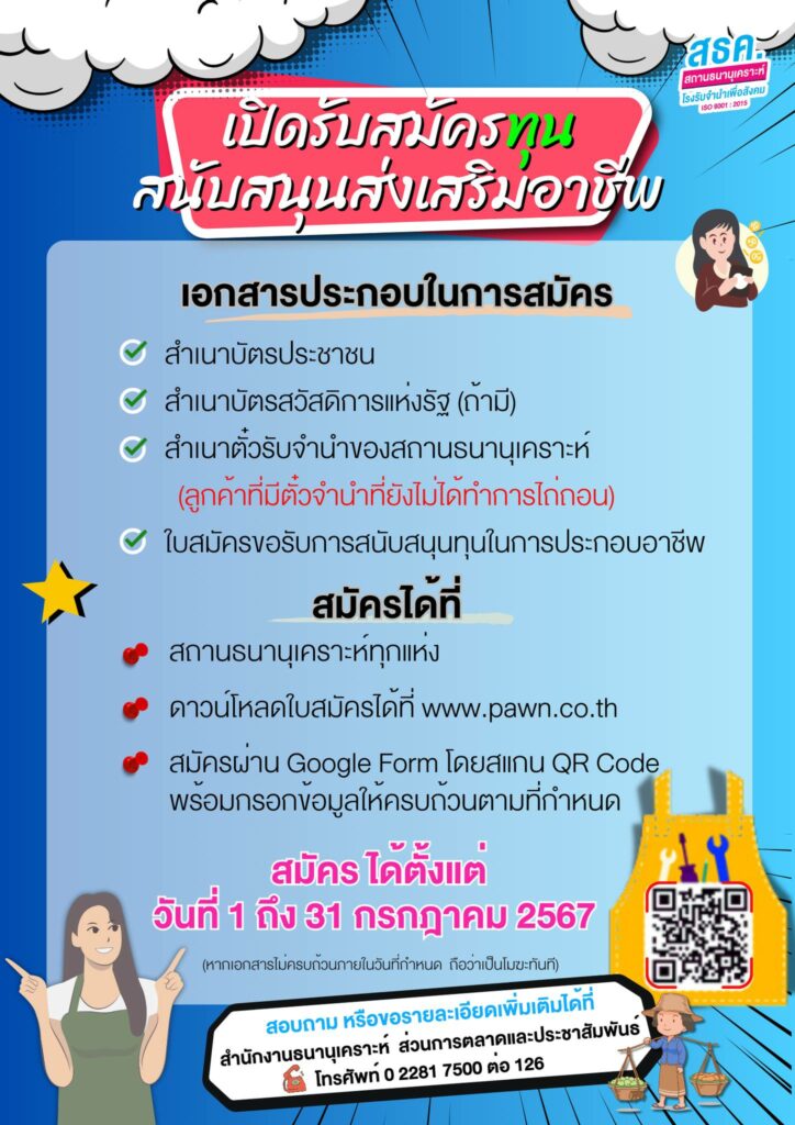 สถานธนานุเคราะห์ โรงรับจำนำของรัฐ เปิดรับสมัครทุนสนับสนุนส่งเสริมอาชีพ ตั้งแต่วันที่ 1 – 31 กรกฎาคม 2567