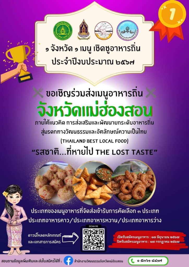 กรมส่งเสริมวัฒนธรรม ขอเชิญร่วมเสนอเมนูเมนูอาหารคาว หวาน และอาหารว่างเข้ารับการคัดเลือกเป็นเมนูอาหารถิ่นจังหวัดแม่ฮ่องสอน 1 จังหวัด 1 เมนู เชิดชูอาหารถิ่น ภายใต้โครงการ ส่งเสริมและพัฒนายกระดับอาหารถิ่นสู่มรดกทางวัฒนธรรมและอัตลักษณ์ความเป็นไทย (Thailand Best Local Food ) “รสชาติ…ที่หายไป” The Lost Taste ประจำปี 2567 ตั้งแต่บัดนี้ – 17 กรกฎาคม 2567