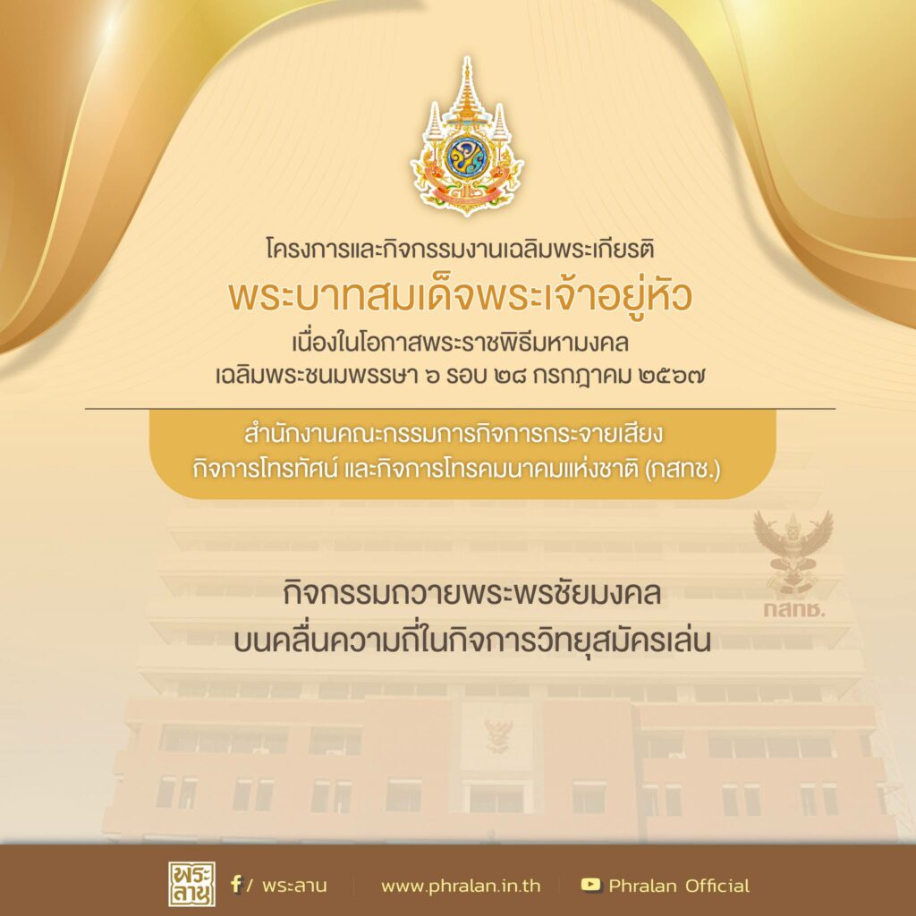 กสทช. จัดกิจกรรมเฉลิมพระเกียรติฯ “กิจกรรมถวายพระพรชัยมงคลบนคลื่นความถี่ในกิจการวิทยุสมัครเล่น” ข่าวสารกิจกรรม กสทช. จัดกิจกรรมเฉลิมพระเกียรติฯ “กิจกรรมถวายพระพรชัยมงคลบนคลื่นความถี่ในกิจการวิทยุสมัครเล่น” สำนักงานคณะกรรมการกิจการกระจายเสียง กิจการโทรทัศน์ และกิจการโทรคมนาคมแห่งชาติ จัดกิจกรรมเฉลิมพระเกียรติพระบาทสมเด็จพระเจ้าอยู่หัว เนื่องในโอกาสพระราชพิธีมหามงคลเฉลิมพระชนมพรรษา พระบาทสมเด็จพระเจ้าอยู่หัว 6 รอบ 28 กรกฎาคม 2567 โดยจัดกิจกรรมถวายพระพรชัยมงคลบนคลื่นความถี่ในกิจการวิทยุสมัครเล่น ที่มา : https://citly.me/VcXjS Post Views: 12 FacebookFacebookXTwitterLINELine