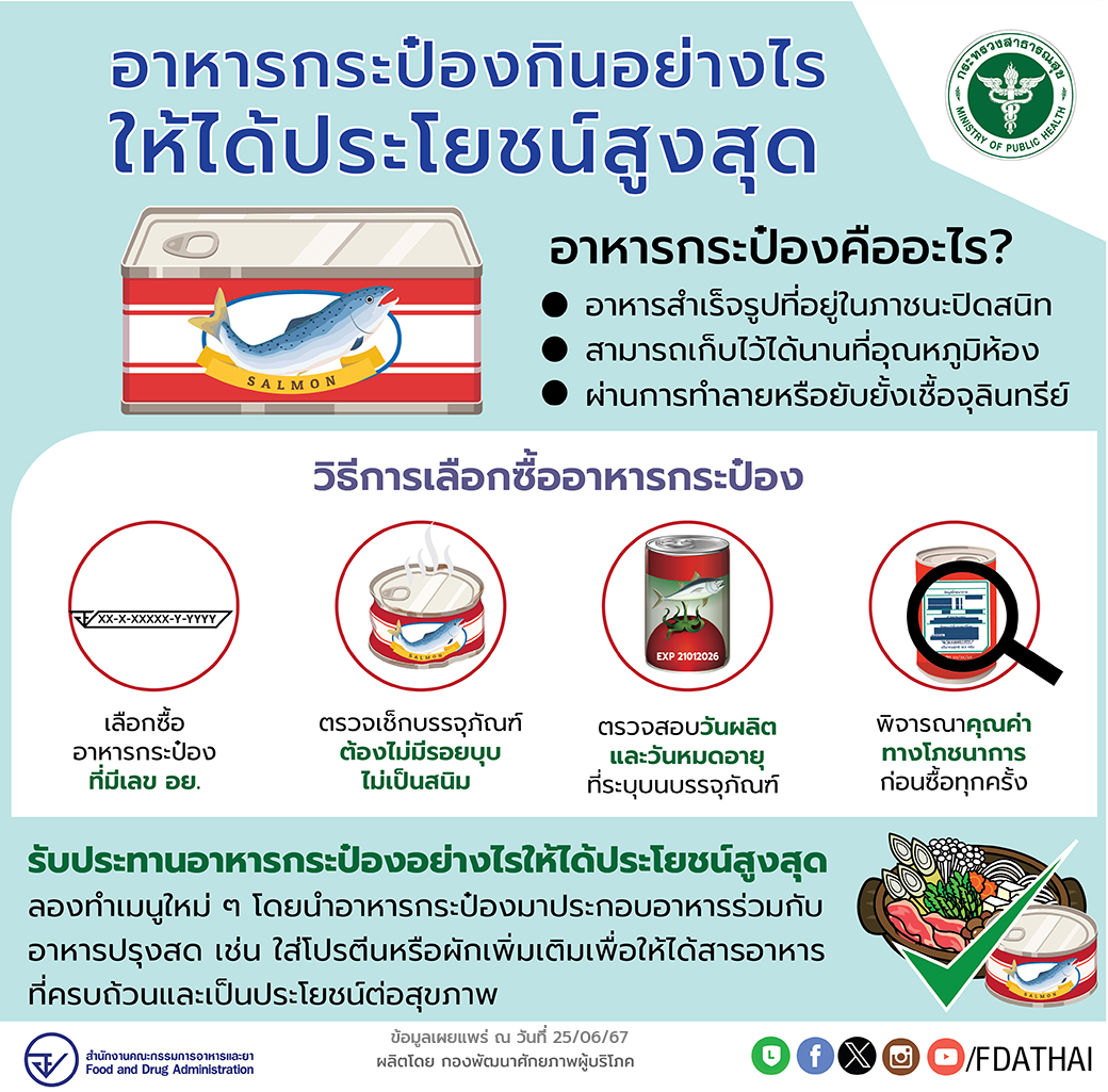 สำนักงานคณะกรรมการอาหารและยา แนะนำอาหารกระป๋องกินอย่างไรให้ได้ประโยชน์สูงสุด โดย อาหารกระป๋อง คืออาหารสำเร็จรูปที่อยู่ในภาชนะปิดสนิท สามารถเก็บรักษาได้นานโดยไม่ต้องแช่ในตู้เย็น อีกทั้งยังสามารถเปิดรับประทานได้ทันทีเนื่องจากในการผลิตได้ผ่านกรรมวิธีการให้ความร้อน เพื่อทำลายเชื้อจุลินทรีย์ที่ก่อโรคและเชื้อจุลินทรีย์ที่ทำให้อาหารเน่าเสีย