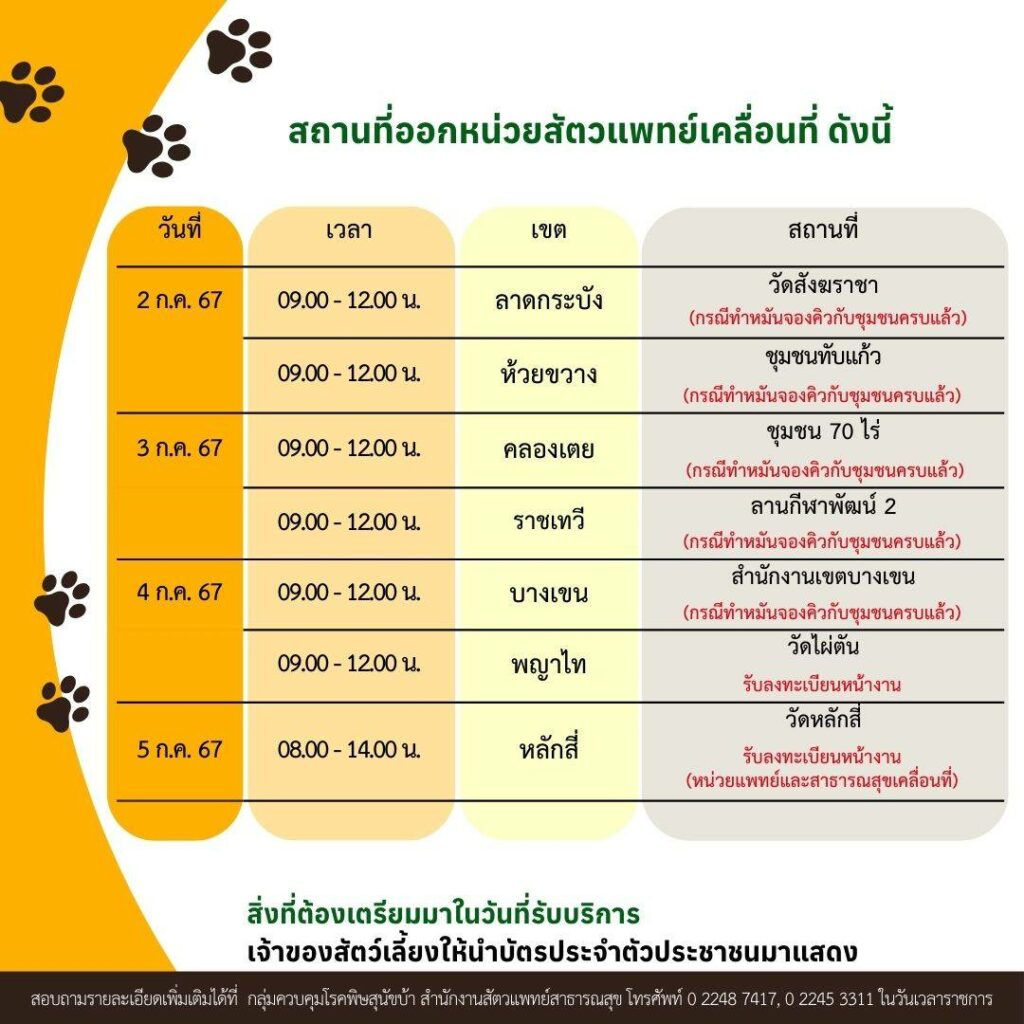 สำนักอนามัย กรุงเทพมหานคร ออกหน่วยสัตวแพทย์เคลื่อนที่ วันที่ 2 – 5 กรกฏาคม 2567