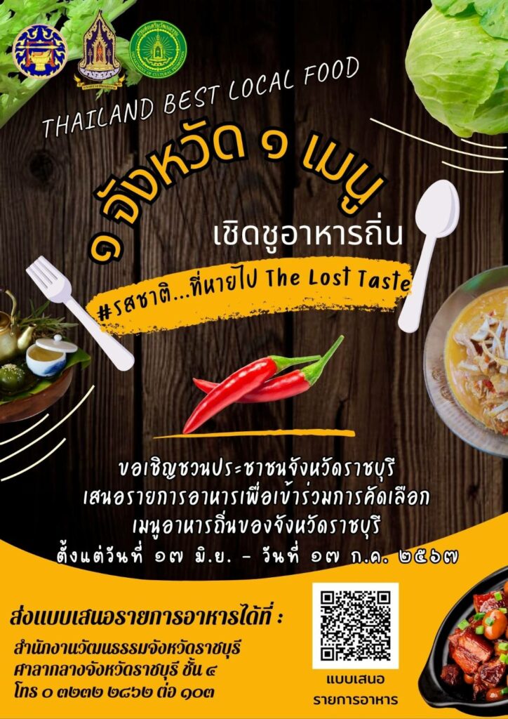 กรมส่งเสริมวัฒนธรรม ขอเชิญร่วมเสนอเมนูเมนูอาหารคาว หวาน และอาหารว่างเข้ารับการคัดเลือกเป็นเมนูอาหารถิ่นจังหวัดราชบุรี 1 จังหวัด 1 เมนู เชิดชูอาหารถิ่น ภายใต้โครงการ ส่งเสริมและพัฒนายกระดับอาหารถิ่นสู่มรดกทางวัฒนธรรมและอัตลักษณ์ความเป็นไทย (Thailand Best Local Food ) “รสชาติ…ที่หายไป” The Lost Taste ประจำปี 2567 ตั้งแต่บัดนี้ – 17 กรกฎาคม 2567 สามารถส่งแบบเสนอรายการอาหารเพื่อเข้าร่วมรับการคัดเลือกได้ที่ สำนักงานวัฒนธรรมจังหวัดราชบุรี สอบถามเพิ่มเติมได้ที่ หมายเลขโทรศัพท์ 0 3232 2862 ต่อ 103
