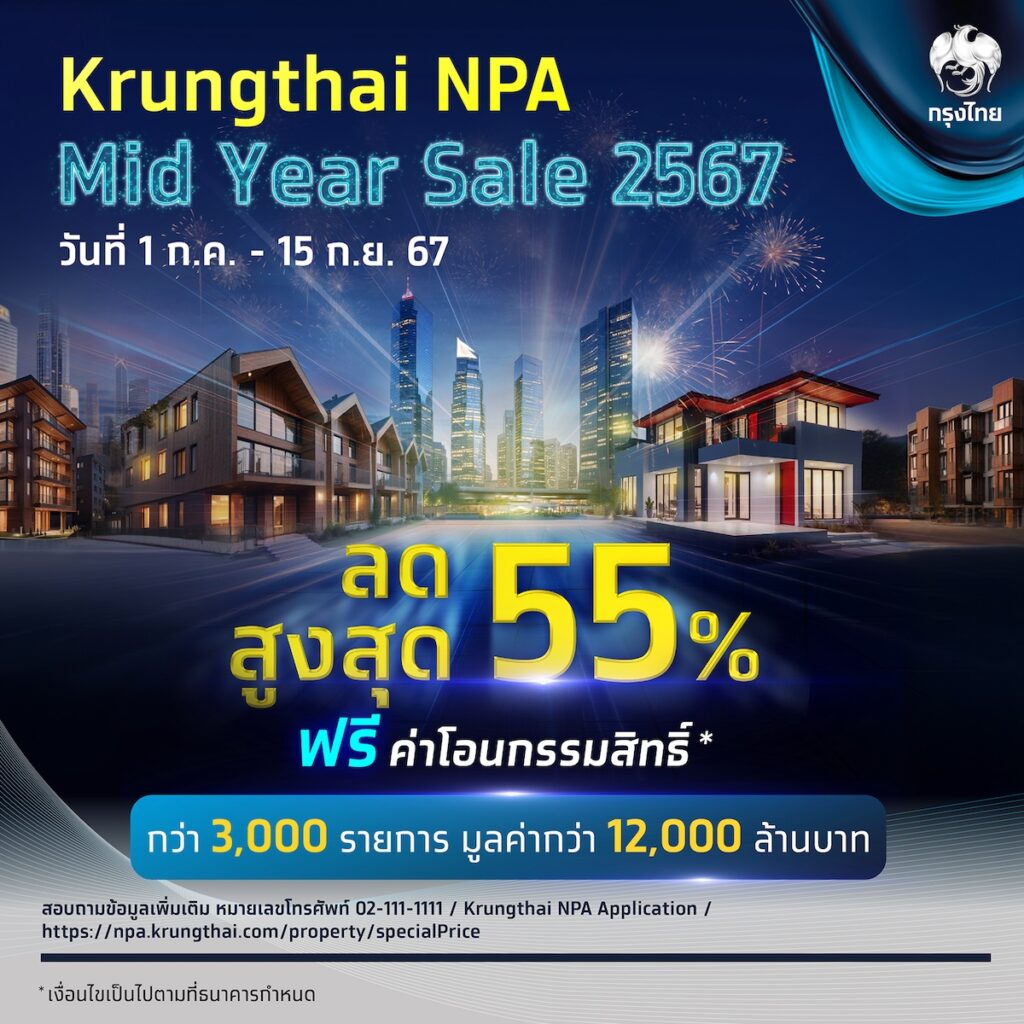 ธนาคารกรุงไทย จำกัด (มหาชน) จัดงานมหกรรมทรัพย์สินพร้อมขาย กลางปี 2567 (Krungthai NPA Mid Year Sale 2567) ยกขบวนทรัพย์สินพร้อมขายทั่วประเทศ กว่า 3,000 รายการ มูลค่ากว่า 12,000 ล้านบาท