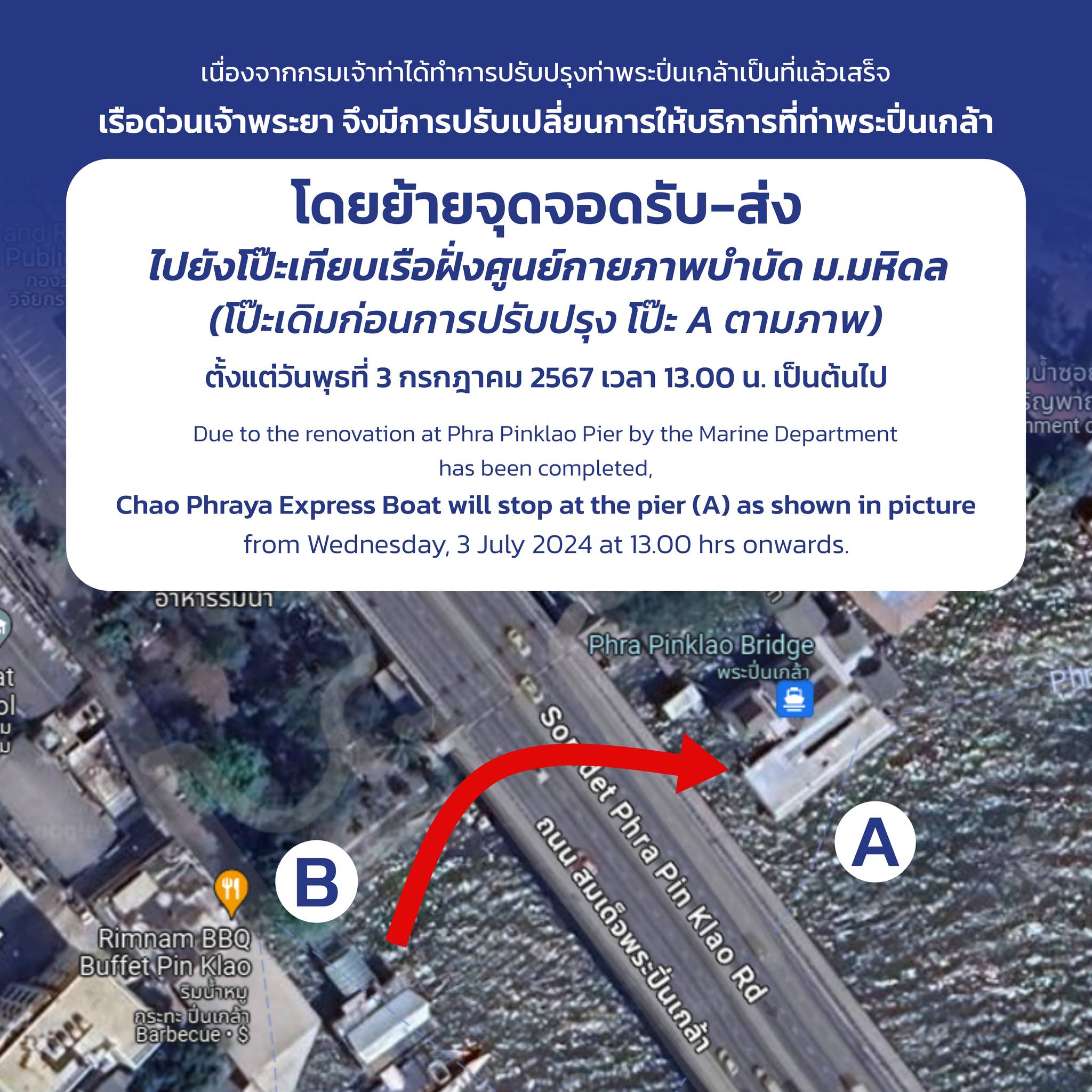 เนื่องจากกรมเจ้าท่าได้ทำการปรับปรุงท่าพระปิ่นเกล้าเป็นที่แล้วเสร็จ เรือด่วนเจ้าพระยา แจ้งปรับเปลี่ยนการให้บริการที่ท่าพระปิ่นเกล้า โดยจะยังจอดรับ-ส่งที่โป๊ะเทียบเรือใกล้ร้านริมน้ำหมูกระทะ (โป๊ะ B ตามภาพ) จนถึงวันพุธที่ 3 กรกฎาคม 2567 เวลา 13.00 น. และหลังจากนั้นจะย้ายจุดจอดรับ-ส่งไปยังโป๊ะเทียบเรือฝั่งศูนย์กายภาพบำบัด ม.มหิดล แทน (โป๊ะเดิมก่อนการปรับปรุง โป๊ะ A ตามภาพ) เริ่มตั้งแต่วันพุธที่ 3 กรกฎาคม 2567 เวลา 13.00 น. เป็นต้นไป หากมีข้อสงสัยสามารถสอบถามข้อมูลเพิ่มเติมได้จากพนักงานบริการบนท่า