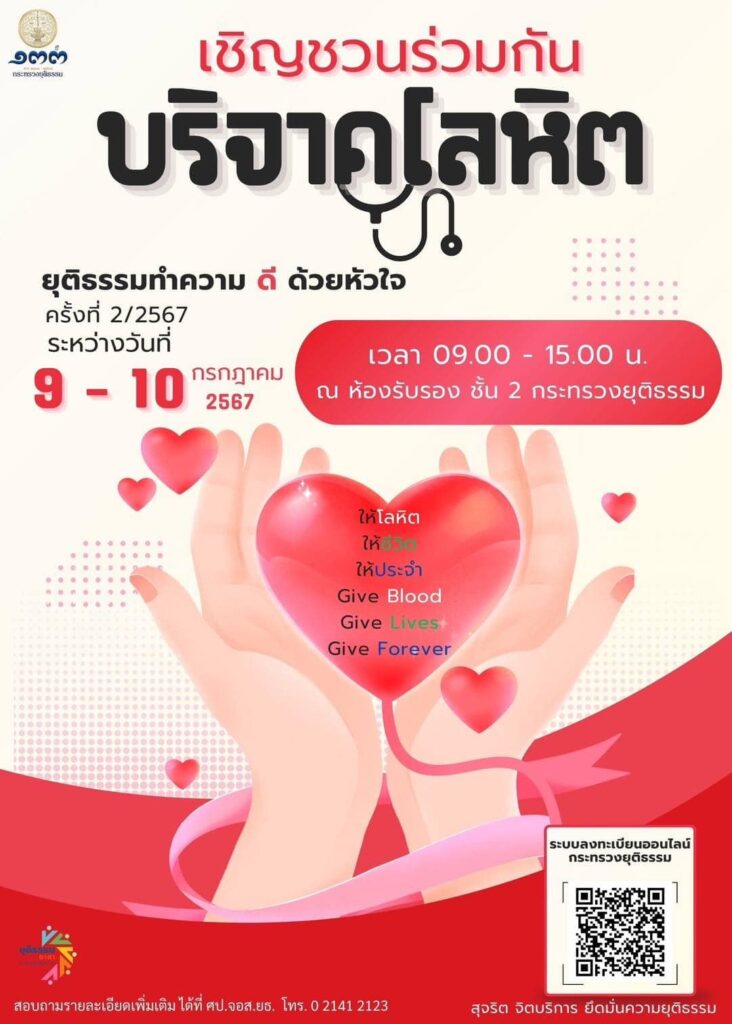กระทรวงยุติธรรม เชิญร่วมบริจาคโลหิต”ยุติธรรมทำความดีด้วยหัวใจ ครั้งที่ 2/2567″ ระหว่างวันที่ 9 – 10 กรกฎาคม 2567 เวลา 09:00 – 15:00 น. ณ ห้องรับรองชั้น 2 อาคารกระทรวงยุติธรรม