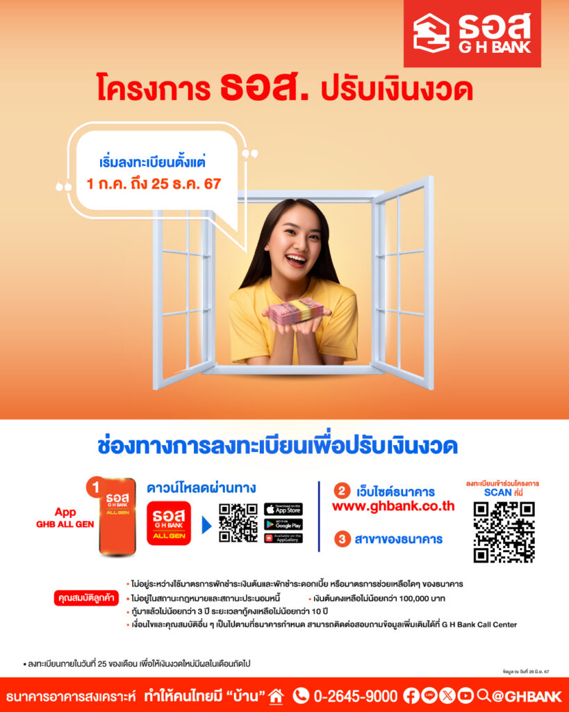 ธนาคารอาคารสงเคราะห์ แนะนำโครงการปรับเงินงวดให้เหมาะกับความสามารถในการผ่อนชำระของลูกค้า ตั้งแต่บัดนี้ – 25 ธันวาคม 2567 ลงทะเบียนเข้าร่วมโครงการฯที่ https://bit.ly/3v80TeB