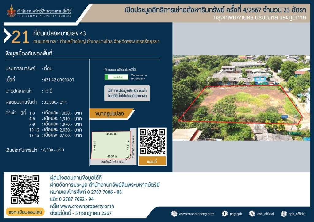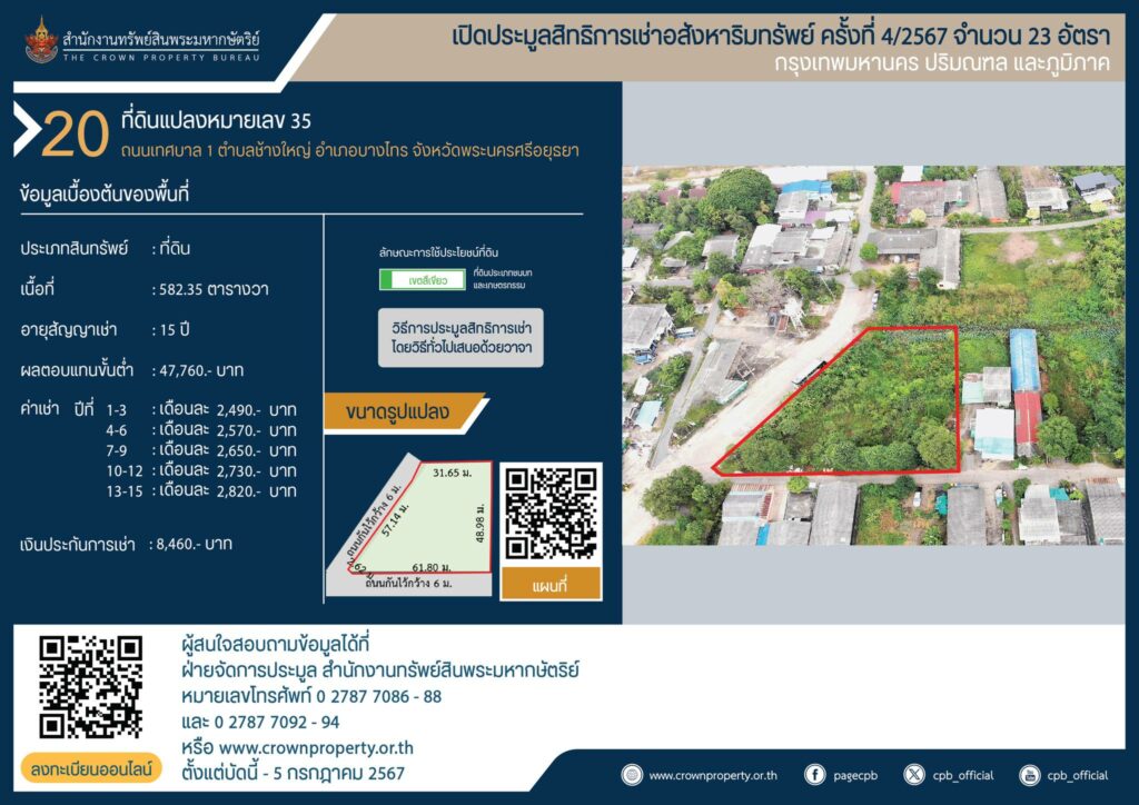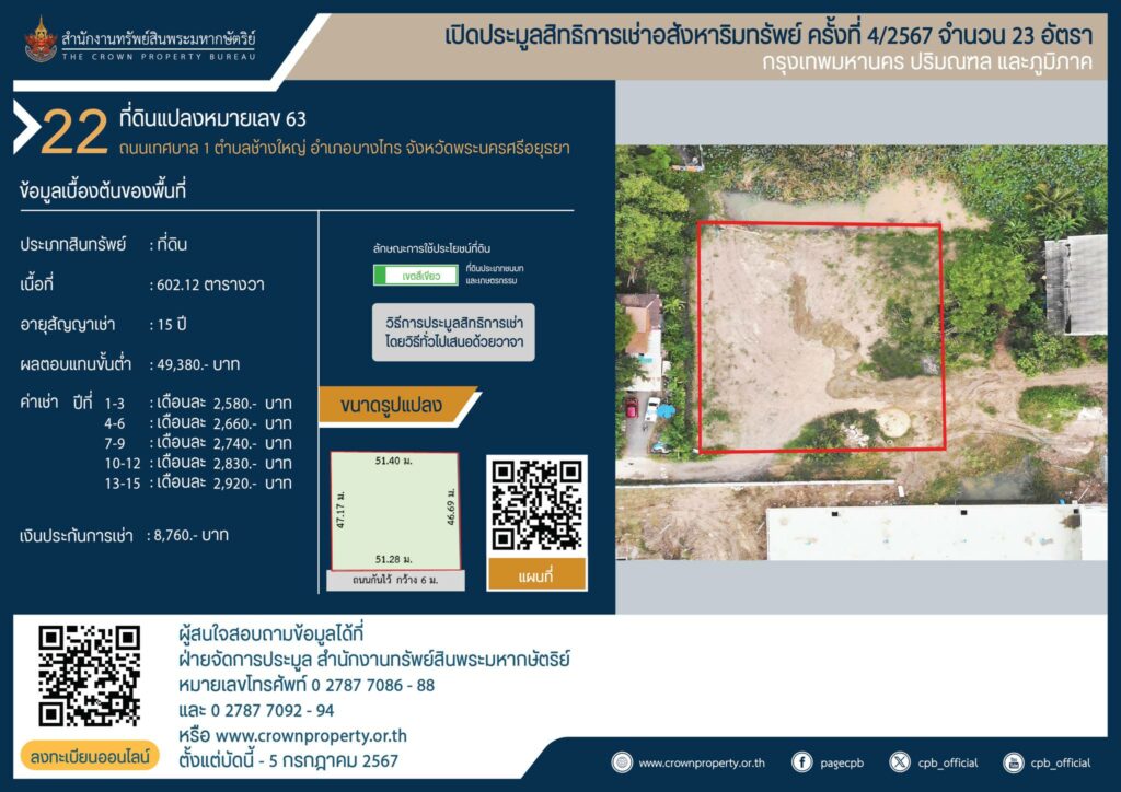 สำนักงานทรัพย์สินพระมหากษัตริย์ เปิดประมูลสิทธิการเช่าอสังหาริมทรัพย์ อำเภอบางไทร ที่ดินแปลงหมายเลข 35,43 และ 63