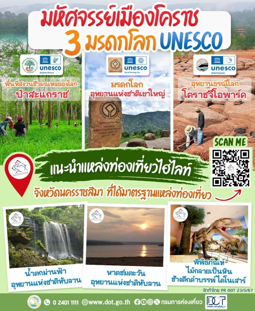 - กรมการท่องเที่ยว แนะนำแหล่งท่องเที่ยวจังหวัดนครราชสีมา ได้รับการขึ้นทะเบียน 3 มรดกโลก จาก UNESCO ได้แก่