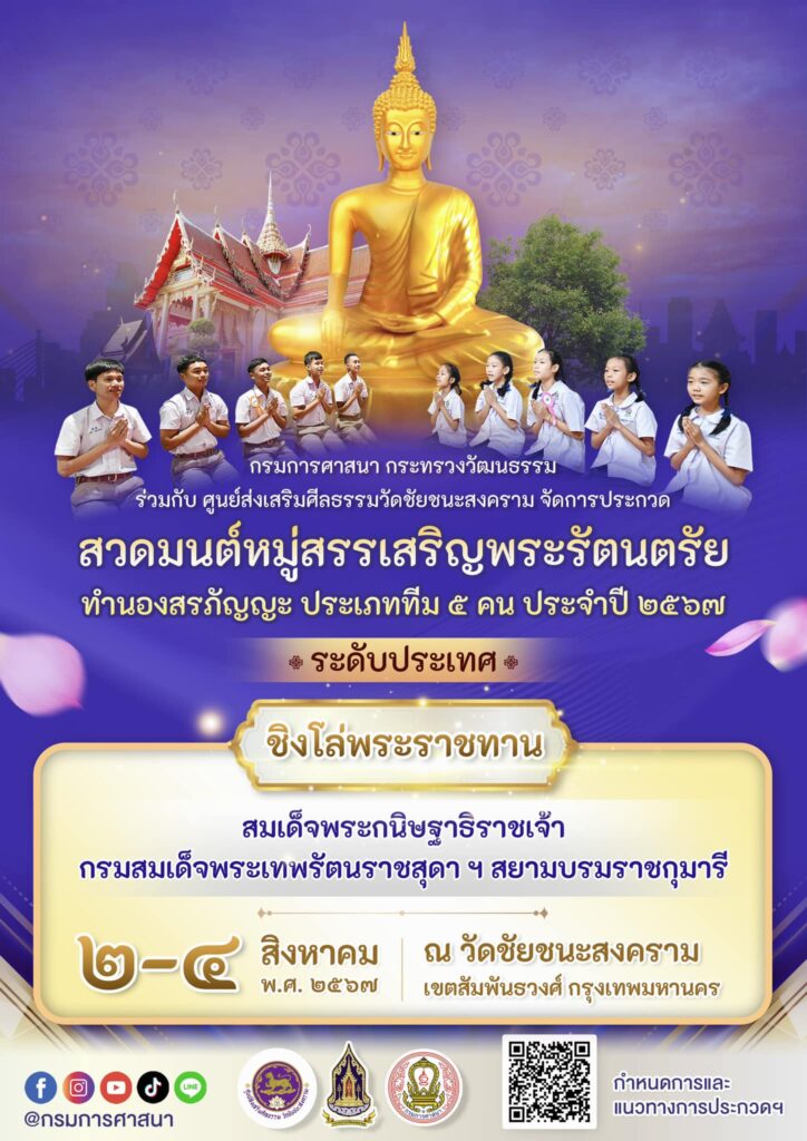 กรมการศาสนา ร่วมกับ ศูนย์ส่งเสริมศีลธรรมวัดชัยชนะสงคราม ขอเชิญชวนสถานศึกษาทั่วประเทศ ร่วมสมัครการประกวดสวดมนต์หมู่สรรเสริญพระรัตนตรัยทำนองสรภัญญะ ประจำปี 2567 ประเภททีม 5 คน ชิงโล่พระราชทาน สมเด็จพระกนิษฐาธิราชเจ้า กรมสมเด็จพระเทพรัตนราชสุดาฯ สยามบรมราชกุมารี ระหว่างวันที่ 2 – 4 สิงหาคม 2567 ณ วัดชัยชนะสงคราม (วัดตึก) เขตสัมพันธวงศ์ กรุงเทพมหานคร สามารถศึกษารายละเอียดเพิ่มเติมๆได้ที่ กรมการศาสนา โทร. 02 209 3730 สำนักงานวัฒนธรรมจังหวัดทั่วประเทศ