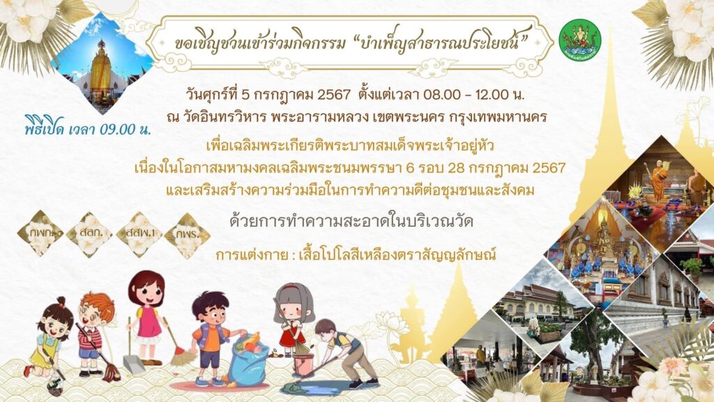 กรมส่งเสริมสหกรณ์ ขอเชิญชวนร่วมกิจกรรม “บำเพ็ญสาธารณประโยชน์” เพื่อเฉลิมพระเกียรติพระบาทสมเด็จพระเจ้าอยู่หัว เนื่องในโอกาสมหามงคลเฉลิมพระชนมพรรษา 6 รอบ 28 กรกฎาคม 2567 และเสริมสร้างความร่วมมือในการทำความดีต่อชุมชนและสังคมด้วยการทำความสะอาดในบริเวณวัด วันศุกร์ที่ 5 กรกฎาคม 2567 เวลา 08.00 – 12.00 น. (พิธีเปิด เวลา 09.00 น.) ณ วัดอินทรวิหาร พระอารามหลวง เขตพระนคร กรุงเทพมหานคร การแต่งกาย เสื้อโปโลสีเหลืองตราสัญลักษณ์